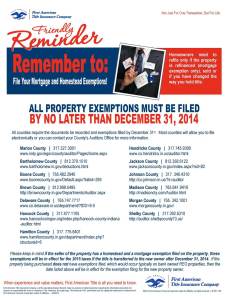 If you purchased property in 2014, please remember to file your Mortgage and Homestead Exemptions by no later than 12/31/14! Please see the attached flyer for specific details and information for your specific county!!